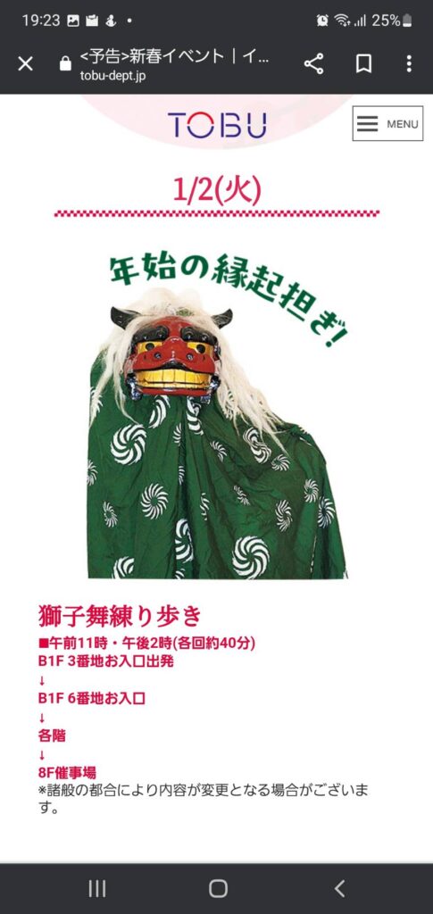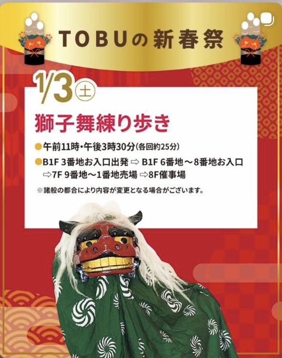 池袋東武百貨店の新春イベントにて獅子舞練り歩きを披露する予定です。